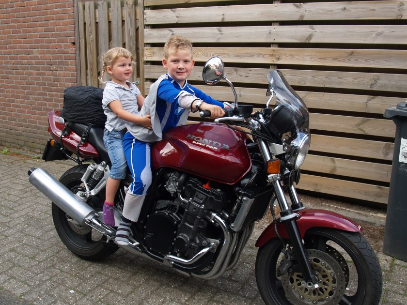 Ik vind dat Hans al aardig stoer kan kijken voor een zesjarige. Hij was even vergeten dat hij een held op sokken is! 🙂 Tammar zit precies zoals een lief meisje achter op de motor moet zitten.