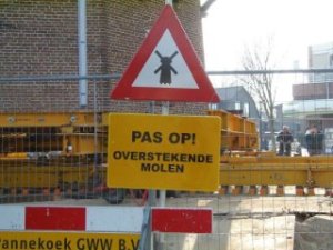 Maar nu dan! Razendknap wat hier gebeurt. De molen wordt een meter of vier verhoogd omdat hij anders uit het zicht verdwijnt en geen wind meer vangt door de skyline die ze hier aan het bouwen zijn. Vaassen, mensen, Vaassen. Parel van de Veluwe, al gebiedt de eerlijkheid mij te zeggen dat elk dorp op de Veluwe die bijnaam voert. Hoe doe je dat dan, een molen ophogen? Nou, het principe is heel simpel. Je zaagt gewoon onderin een gat en plaatst daar een krik met wielen. Vervolgens doe je aan de andere kant hetzelfde, en zo vort en zo vort. Deze truuk herhaal je net zolang totdat je de hele molen los hebt van de fundering en hij compleet op de krikken rust. Dan sleep je de molen een eind opzij en metselt een mooi rond muurtje van vier meter hoog op de funderingen. Vervolgens rij je hem terug, krik je hem op, een beetje secondenlijm ertussen en klaar. Het is een simpel principe, en zoals ik het uitleg, stort-ie onherroepelijk in. Ik vind dit knapper dan het bouwen van de piramides van Gizeh, of dat van de Chinese muur, want die zijn constructief toch stukken simpeler. En dan dat bord erbij…briljant.